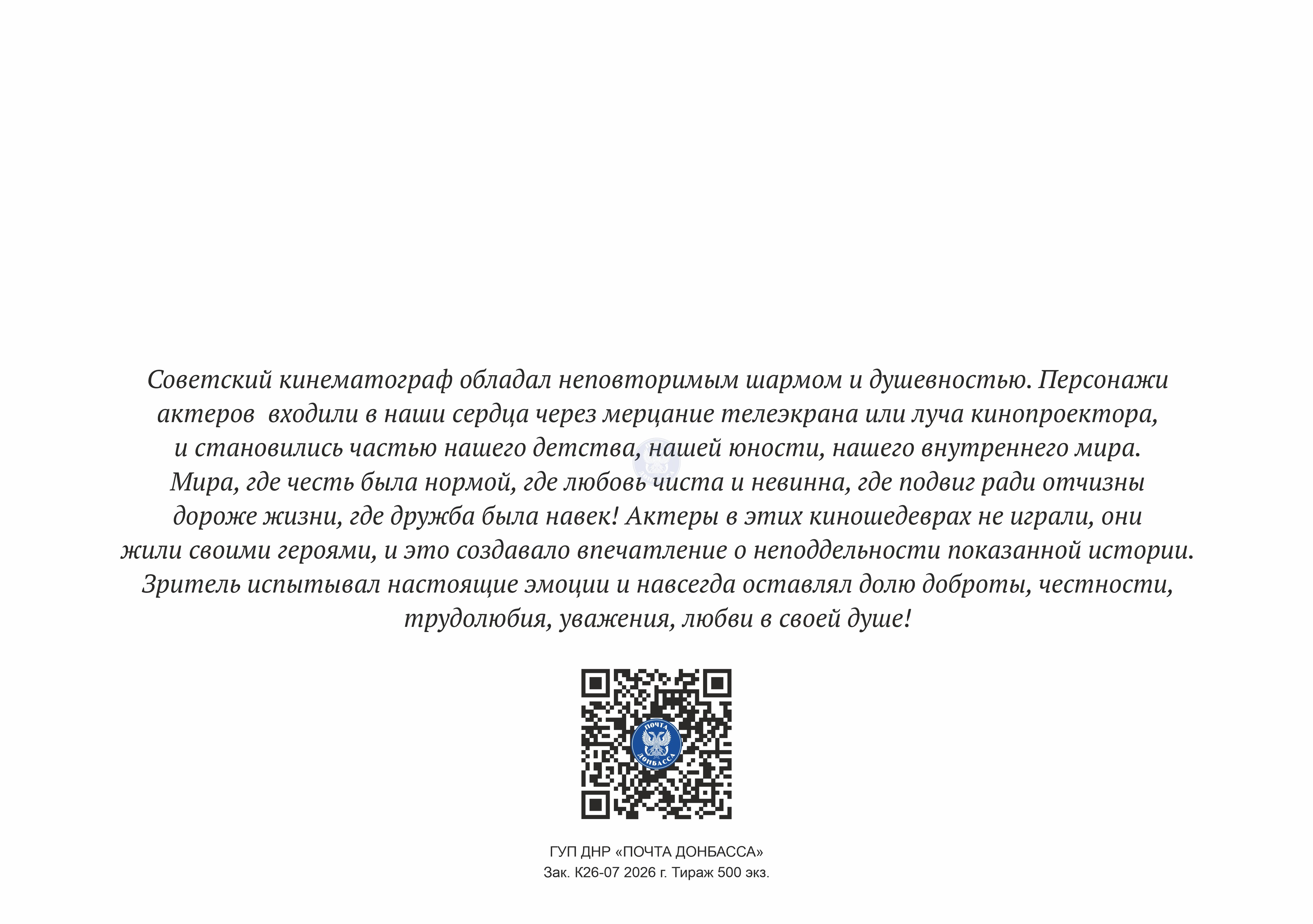 Советский кинематограф обладал неповторимым шармом и душевностью. Персонажи актеров входили в наши сердца через мерцание телеэкрана или луча кинопроектора, и становились частью нашего детства, нашей юности, нашего внутреннего мира. Мира, где честь была нормой, где любовь чиста и невинна, где подвиг ради отчизны дороже жизни, где дружба была навек! Актеры в этих киношедеврах не играли, они жили своими героями, и это создавало впечатление о неподдельности показанной истории. Зритель испытывал настоящие эмоции и навсегда оставлял долю доброты, честности, трудолюбия, уважения, любви в своей душе!